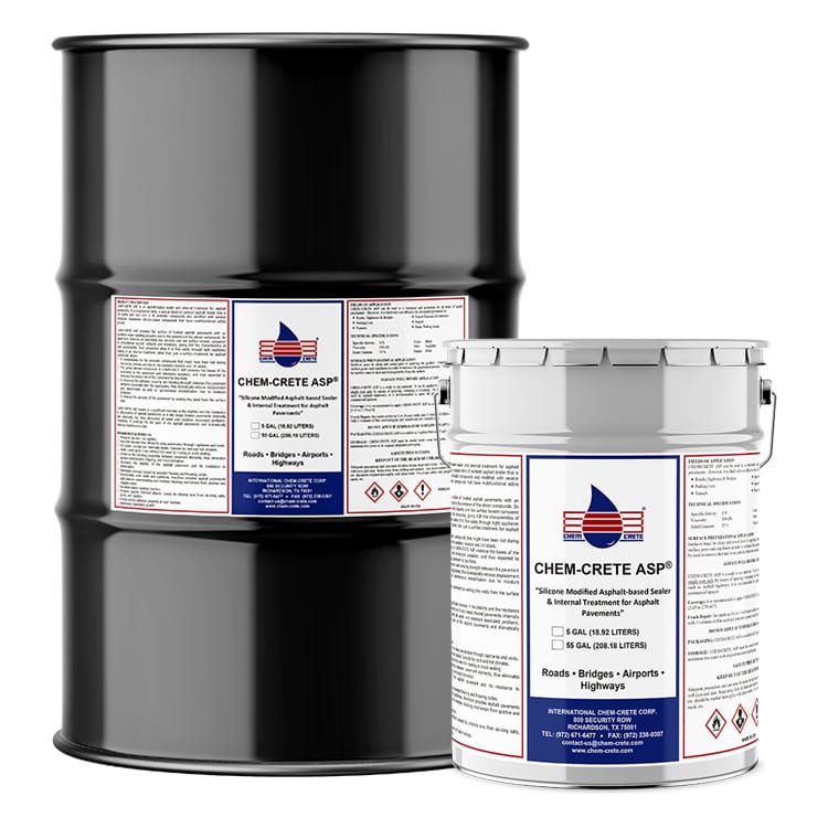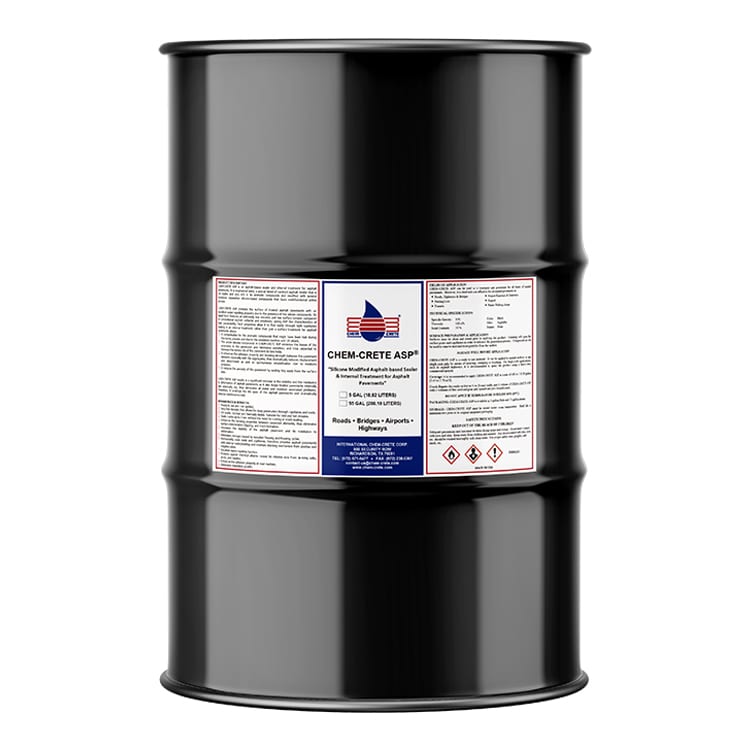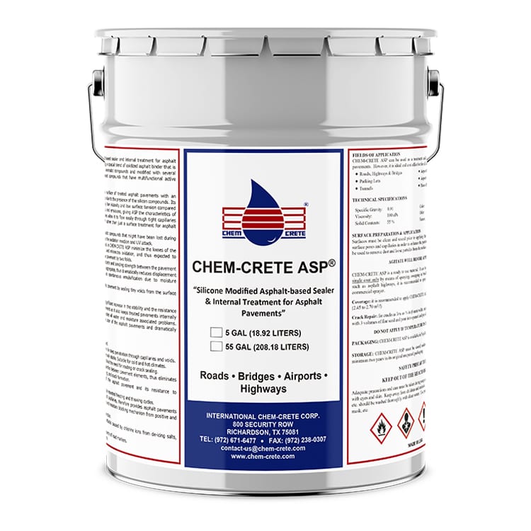 CHEM-CRETE ASP® is a silicone-modified asphalt pavements sealer. It is engineered using a special blend of oxidized asphalt binder that is UV stable and very rich in its aromatic compounds and modified with several moisture-insensitive silicone-based compounds that have multifunctional active groups.