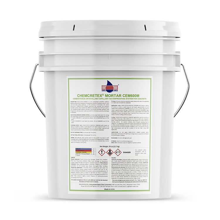 Curing: CHEMCRETEX® MORTAR CEM600M applications must be cured for a minimum of two days. After initial set, it is critical to moist cure using water spray. CHEMCRETEX® MORTAR should be fog sprayed 3 to 4 times daily for a two-day period. For warmer climates, more frequent spraying may be required. It is important to keep the CHEMCRETEX® CONCENTRATE CEM60OM moist to allow crystals formation to occur. CHEMCRETEX® MORTAR CEM600M must be protected from extreme weather conditions such as strong wind, freezing, high temperatures and rain for a period of not less than 2 days after application.